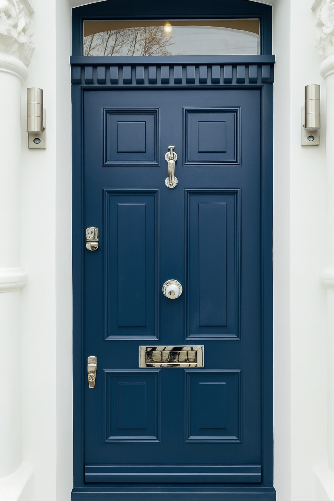 + Polished chrome ironmongery. Integrated letterplate. High-security locks: Banham M2003 & L2000