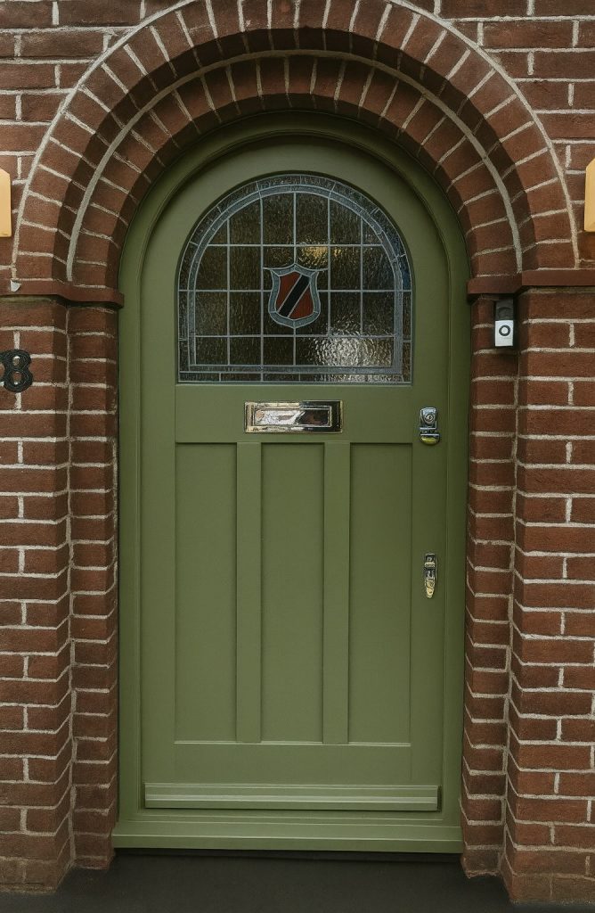 + Mahogany Meranti hardwood. New like-for-like stained-glass unit. Factory spray-painted Farrow & Ball ‘Sap Green’ gloss finish, inside & out. +